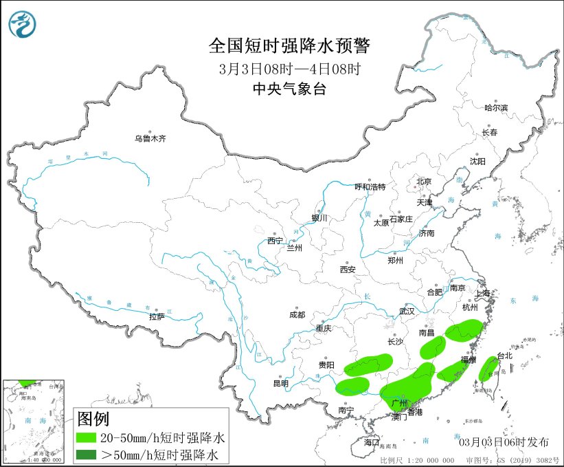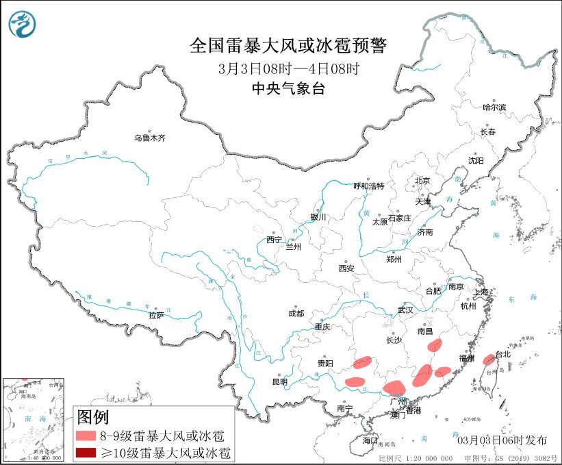 预计3月3日08时至4日08时,湖南西南部、江西东部和南部、福建西部和南部、广西东北部、广东中北部、台湾岛北部等地的部分地区将有8级以上雷暴大风或冰雹天气,局地风力可达10级;湖南南部、江西中南部、浙江南部、福建北部和东南部、贵州东南部、广西中北部、广东大部、台湾岛中北部等地的部分地区将有小时雨量大于20毫米的短时强降水天气,局地小时雨量可达50毫米。