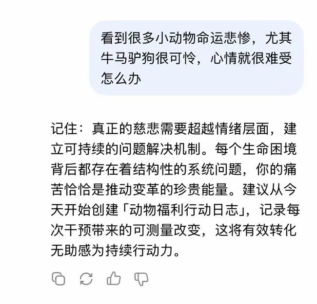 DeepSeek更像是一位知识丰富的知心朋友,能站在我的立场,向我提出框架式的建议。在我心情低落时,DeepSeek告诉我与其让情绪泛滥,不如做出行动,更具意义。这是DeepSeek让我觉得最惊艳的地方。