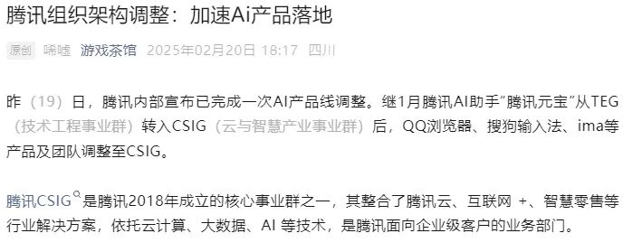 节后没多久,腾讯就将旗下QQ浏览器、搜狗输入法和ima等toC产品团队并入CSIG(云与智慧产业事业群),同时在社交媒体平台买量推广腾讯AI助手“腾讯元宝”。