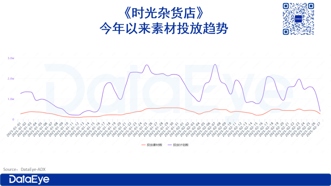 情人节前后也有这种态势,DataEye-ADX数据显示:在2025年农历春节前后15天买量投放TOP100的游戏中,其中有进行版更的游戏,有10款是在情人节前3天或当天开启版本更新。例如《时光杂货店》在1月16日和2月10日都进行了更新,在更新后便开始加大力度投放。
