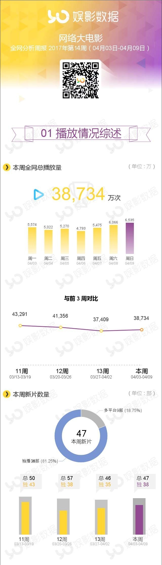 2017年第14周(4月3日-4月9日),网络电影全网主要视频平台累积播放量约为3.87亿,环比上升了3.5%,同比上周增加了1325万播放量。