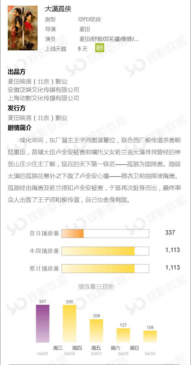 《大漠孤侠》于2017年4月5日于爱奇艺独播上线,首日播放量为337万。上线5天,播放量达1113万。据了解,该片是麦田执导映画“侠系列”电影的第一部。从内容准入层面来看,该片主要传递“侠之大者为国为民”的侠客精神,向受众、向网大行业表达了为作品精品化的努力,作品制作过程具有一定的匠人精神。(戳我回顾)
