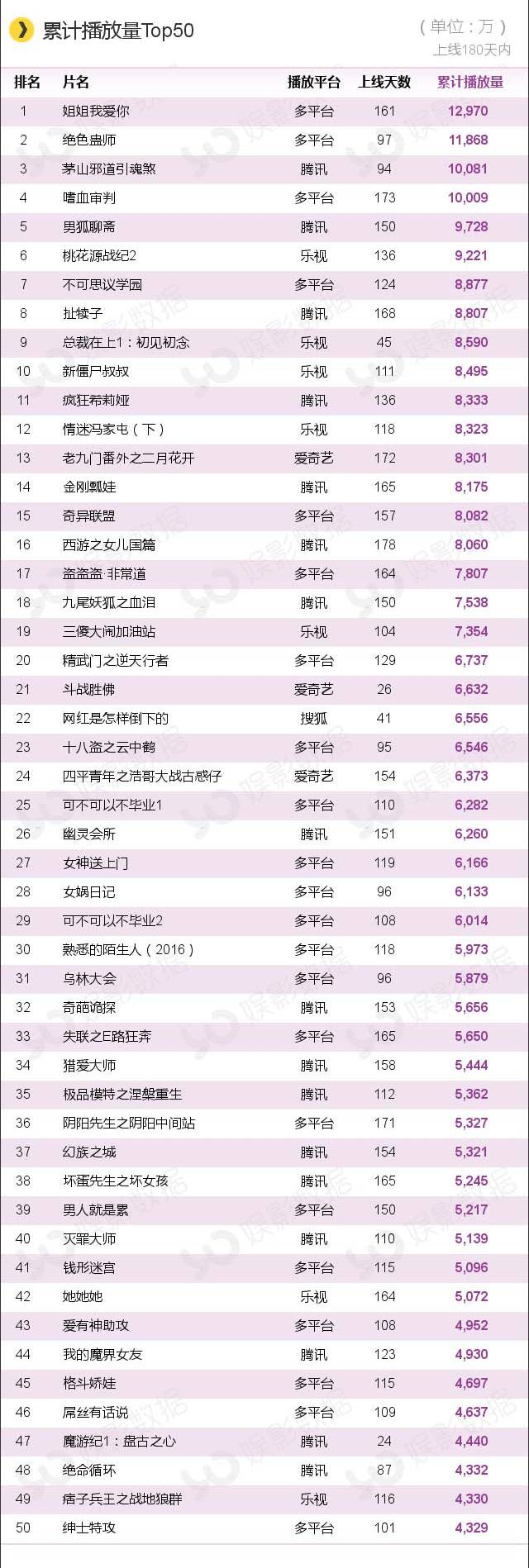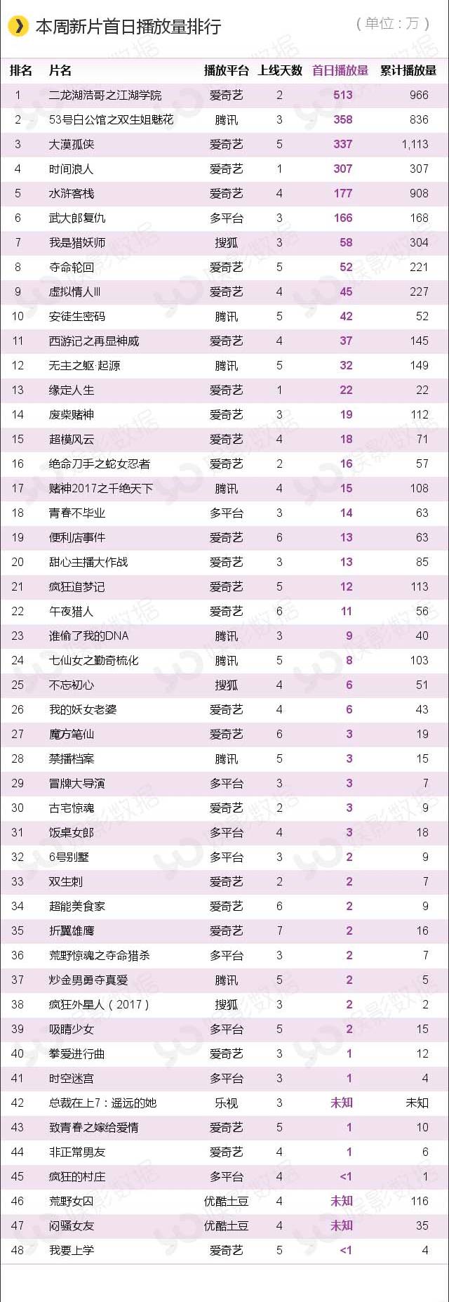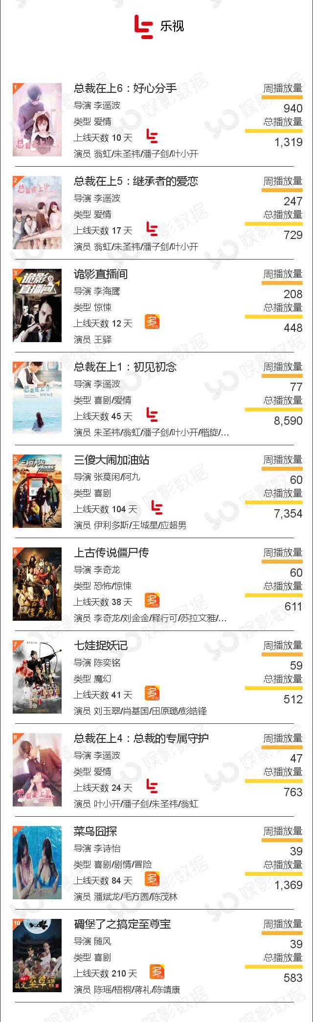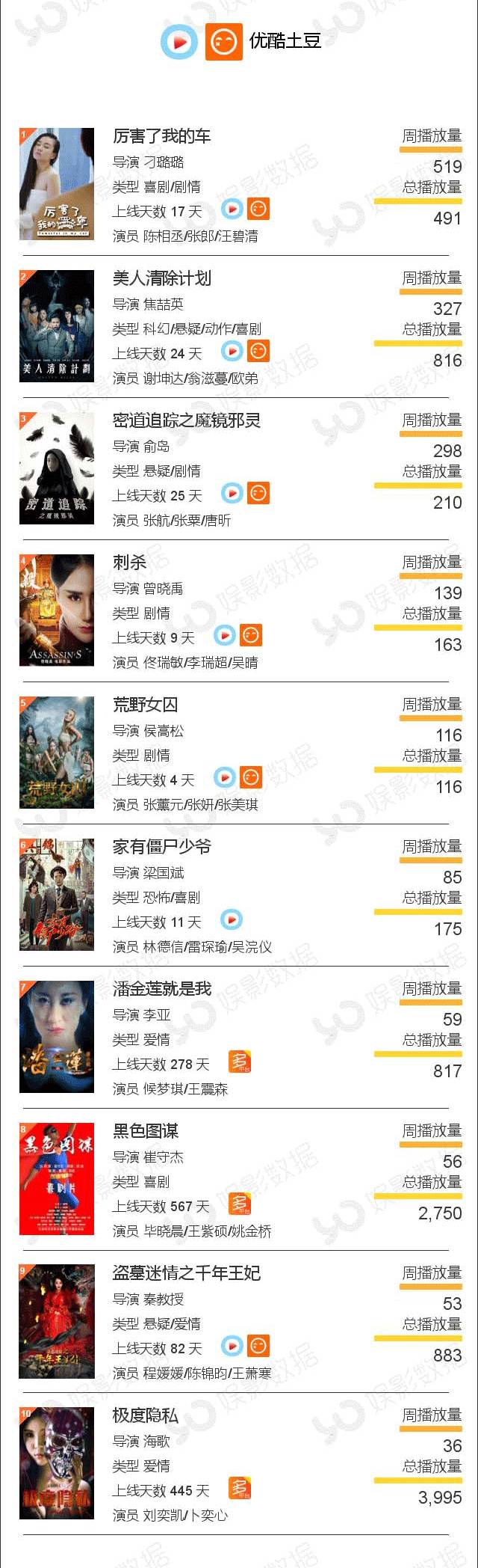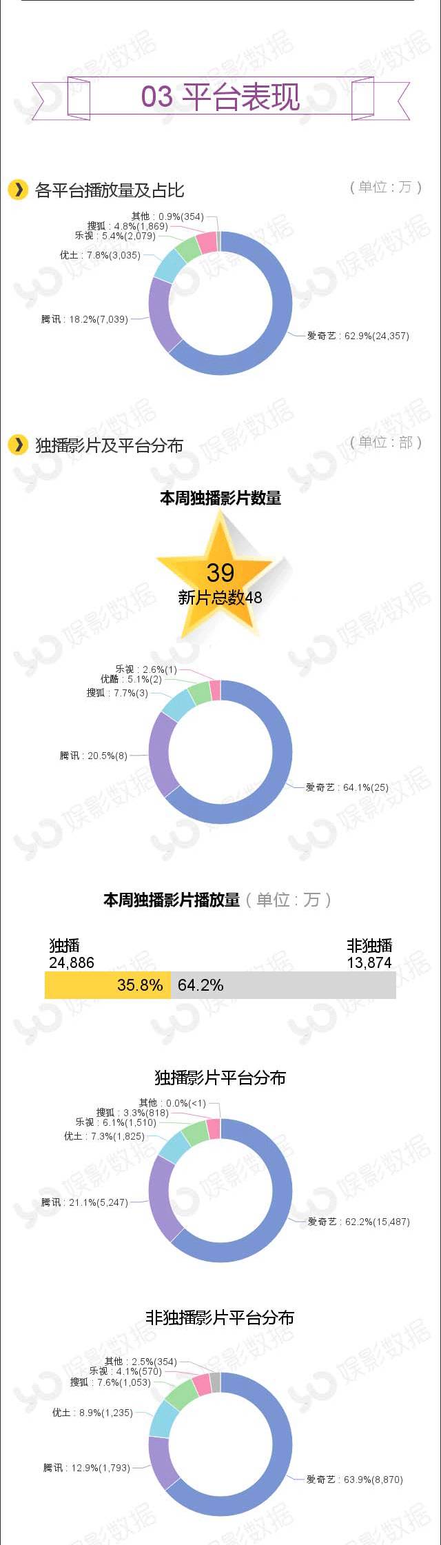 从各平台影片的播放量排名上来看:本周,爱奇艺播放量TOP10影片中,独播影片为9部,1部为多平台独播影片,其中有5部为本周新片;腾讯播放量TOP10影片,均为腾讯独播影片,其中2部为本周新片;乐视播放量TOP10榜单中,独播影片与多平台影片各占5部;搜狐视频播放量TOP10中,搜狐独播影片仅占3部,多平台影片为7部;优土平台有3部独播影片,其余7部均为多平台影片。