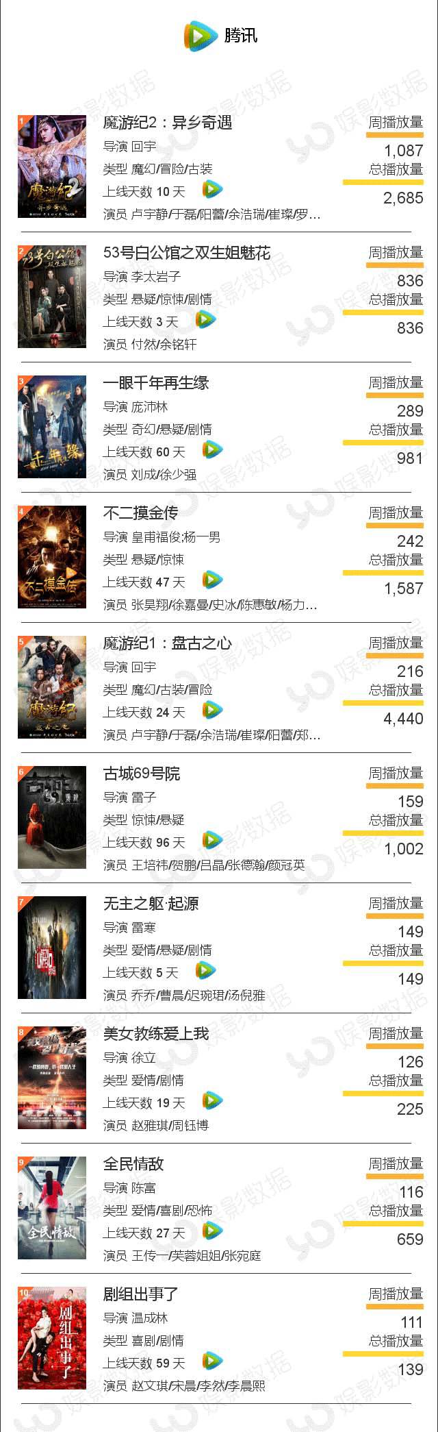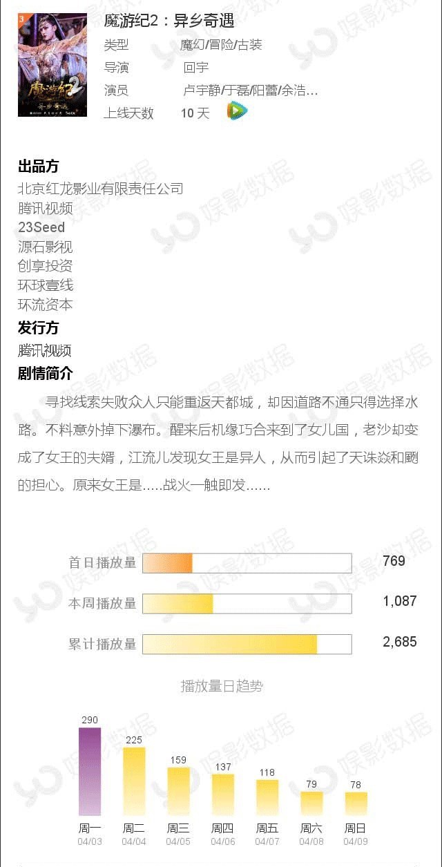 《魔游纪2:异乡奇遇》在腾讯平台上线。本片上线10天,其累计播放量已达2685万。本周,该片以769万的播放量成为本周排名第3的影片。根据腾讯娱乐报道,现魔游纪前两部《魔游纪1:盘古之心》与《魔游纪2:异乡奇遇》专辑播放总量共计突破1.2亿,弹幕超过90万,评论超过1.5万条。