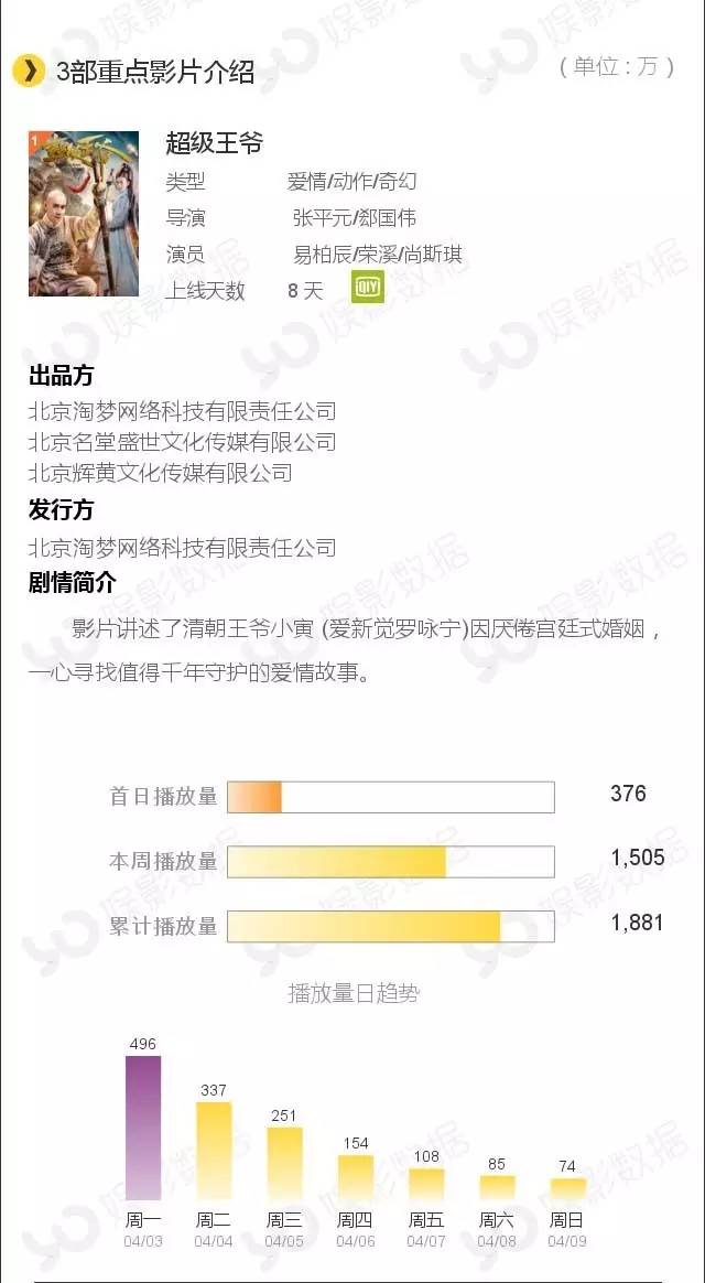 《超级王爷》于2017年4月2日在爱奇艺独播上线,以1505万的播放量,位列本周全网播放量第一名,累计播放量达1881万。从该片上线一周内的日播放量来看,播放量逐日降低的趋势明显。