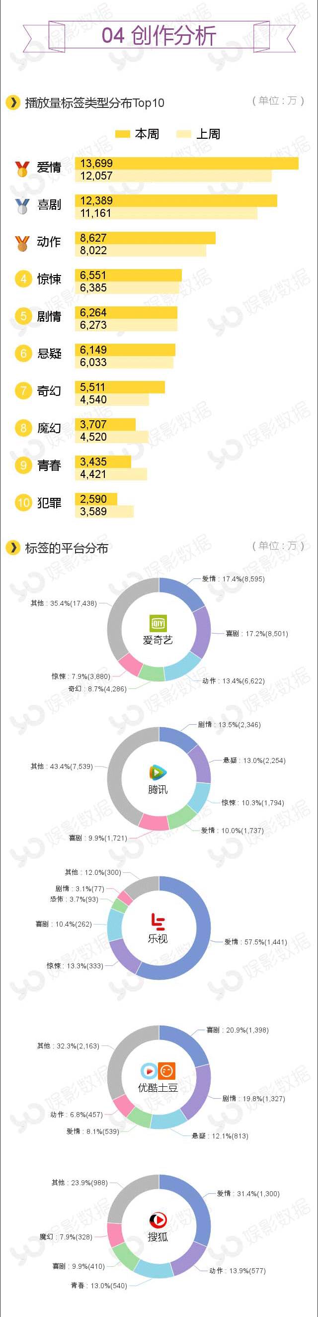 在各平台不同的类型偏好中,爱奇艺以包含爱情、喜剧、动作标签或此类型的影片为主;腾讯本周播放量TOP10影片以包含剧情、悬疑、惊悚标签或此类型的影片为主;乐视以包含爱情、惊悚、喜剧类标签或类型的影片居多;优土以喜剧、剧情、悬疑类影片居多,搜狐以爱情、动作、青春类标签或类型影片为主。