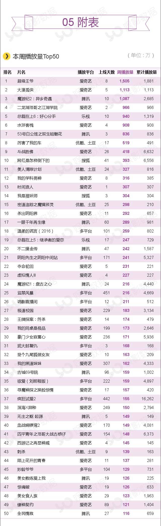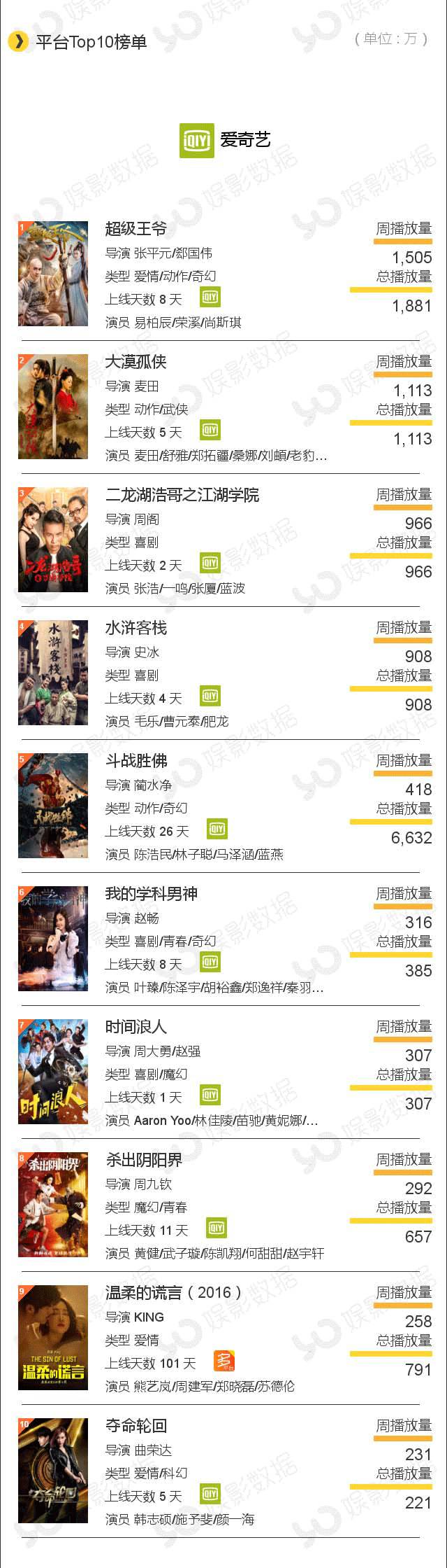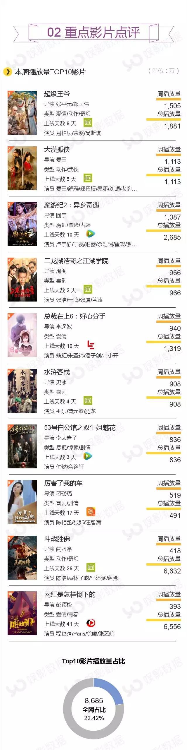 从周播放量TOP10的影片来看,本周新片仅占4部,与上周持平;剩余6部上榜影片中,有3部为上周新片。从单片播放量来看,尽管《超级王爷》以1505万的播放量成为本周播放量最高的影片,但与上周播放量最高的单片《魔游纪2:异乡奇遇》相比,仍有一定差距。