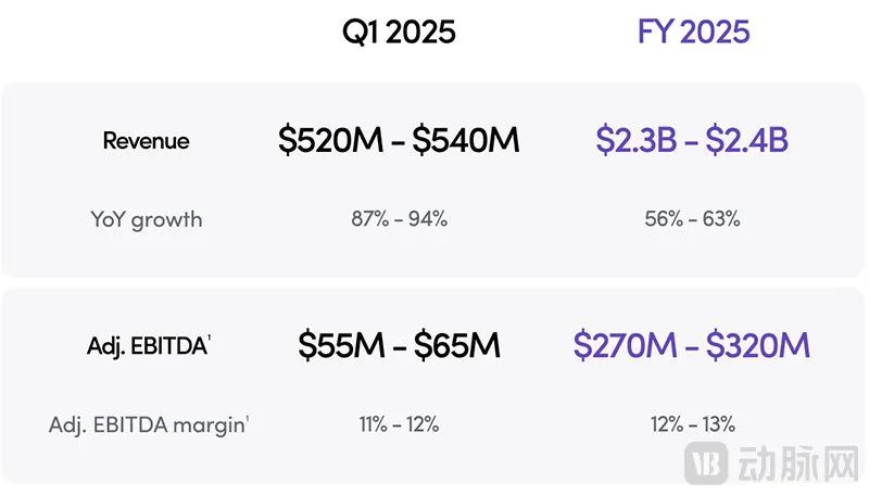 如果对于Hims &Hers在2024财年取得的成绩感到震撼,那么Hims &Hers的管理团队对2025年做出的预测恐怕会让最乐观的人都感到震撼——预测2025财年营收高达23-24亿美元,增长56-63%;第一季度预测营收增长高达87-94%,达到5.2-5.4亿美元的营收。