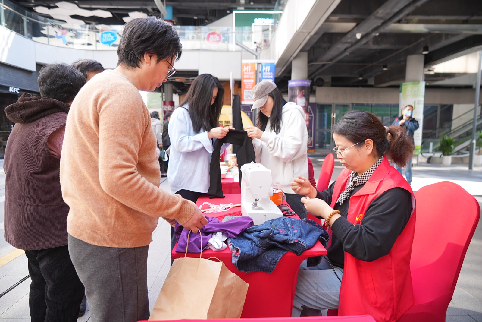走进“丰邻集市”,映入眼帘的是一派热闹景象。在 "便民服务加油站",由青年夜校学员组成的缝补团队正专注地为居民修补衣物,这抹穿梭的银针不仅缝补着生活细节,更将课堂所学转化为服务社区的实践力量。一旁的理发、修伞、磨刀摊位前也排起长队,志愿者们化身 "全能管家",让居民切实感受到 "小事不出社区" 的便利。