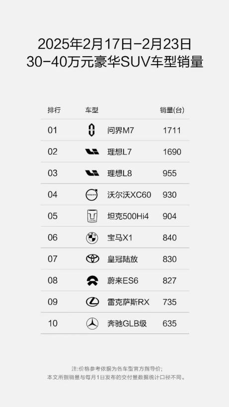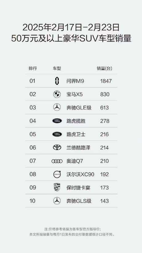 问界自上市以来,凭借卓越的产品实力,已在豪华汽车市场抢占一席之地。问界已收获超50万用户,也是目前均价超过40万元的唯一国产品牌,成为国产豪华品牌标杆。2025年第8周销量榜单数据显示,问界M9与问界M7两款豪华SUV车型持续霸榜,以绝对优势力压一众海外豪华品牌。