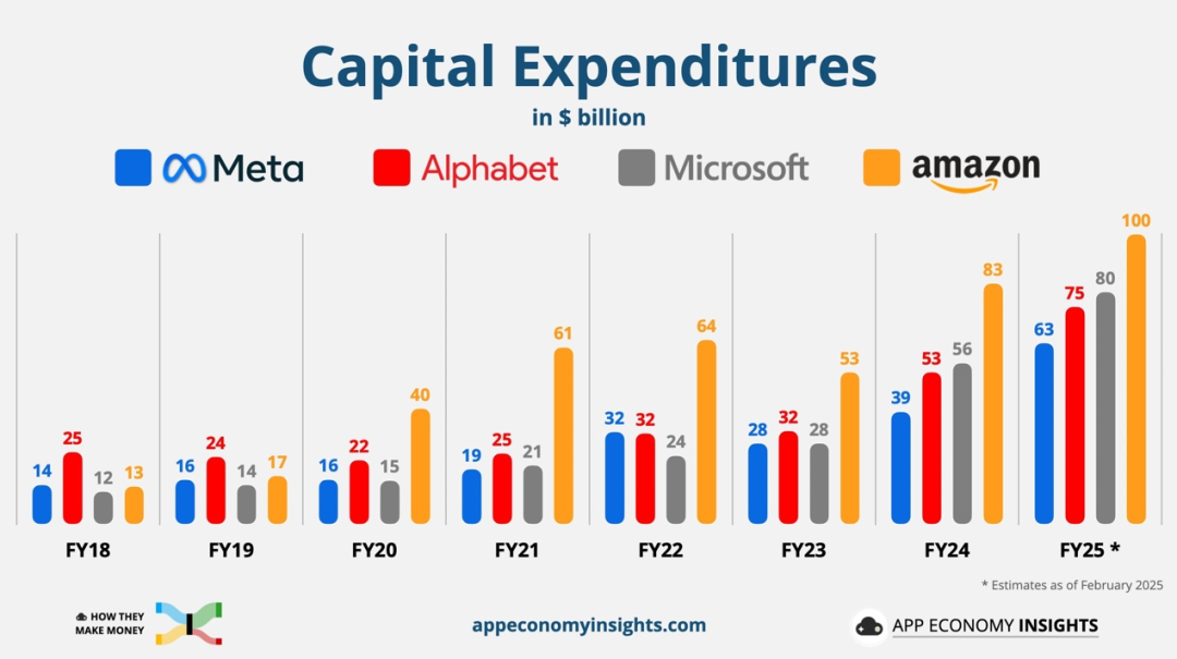 具体来说,Meta预计2025年会花费1000亿-1190亿美元,其中大部分资金将投入到AI技术和相关业务上,而谷歌的计划则是投资750亿美元,这个数字远高于市场之前预期的588亿美元。再看亚马逊,他们将投入1000亿美元用于AI相关发展,而微软则预计在2025财年投入800亿美元。