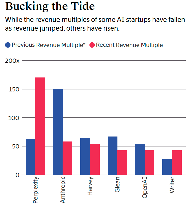 比如硅谷两家当红AI公司OpenAI和 Anthropic,基于估值与年收入的倍数关系,现在已经比去年更便宜了。尤其Anthropic的估值倍数绝对值几乎已经减半。这是在公司成长、收入逐渐赶上投资者高期望的典型现象。
