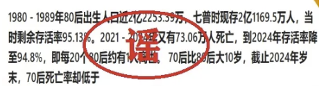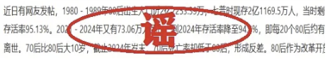 经查,网民“夏老师在上海”发布视频“80后到底还剩多少人”,捏造“80后剩余存活率降至94.8%(死亡率5.2%)”,成为后续系列谣言数据来源。
