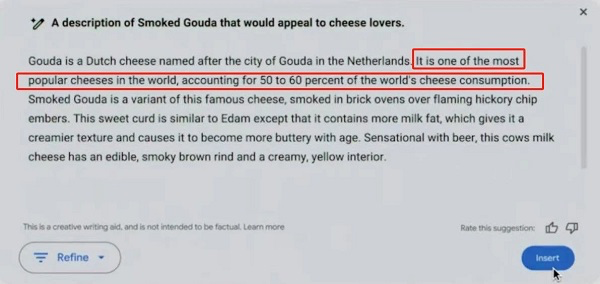 在全美盛事“超级碗”期间,谷歌本想通过50个州的50个小微企业案例,来展示Gemini AI如何帮助商家经营增长,以赢得更多潜在客户对AI营销的兴趣和尝试。却未曾想到,其中一个奶酪商家用AI生成的产品描述“Gouda占据了全球50-60%的奶酪消费”(for 50 to 60 percent of the world’s consumption)引发大面积质疑。眼尖的奶酪爱好者指出这一数据明显与事实不符。