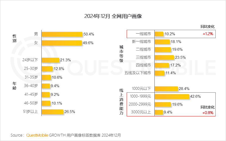 1.3 在就业压力大的背景下,人们涌向就业机会与资源更加丰富的一线城市,其活跃占比同比提升1.2%;线上线下的价格差距持续缩小,部分消费者回归线下购物,用户线上消费能力仅有小幅增长