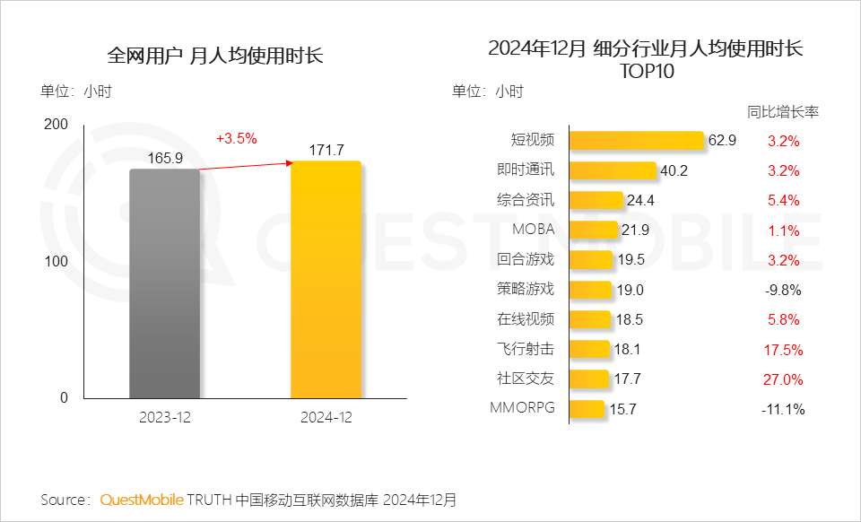 1.4 用户对互联网的使用程度加深,对于内容消费需求日益增长,注意力更多地流向视频、社交、游戏等领域,整体月人均使用时长同比增长近6小时