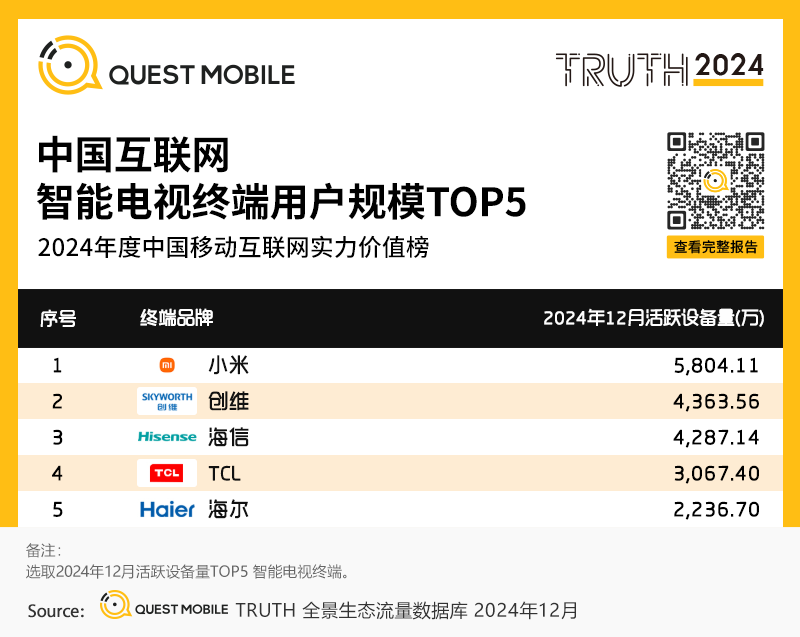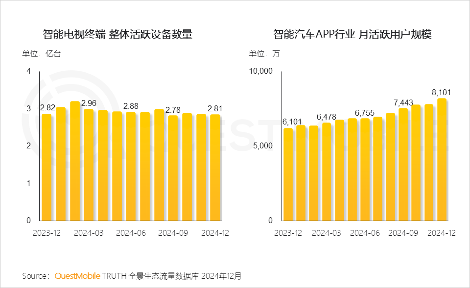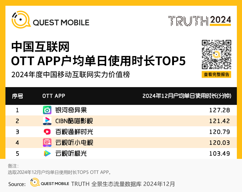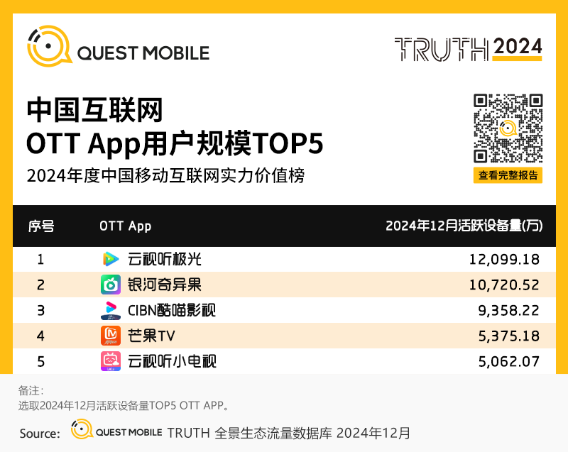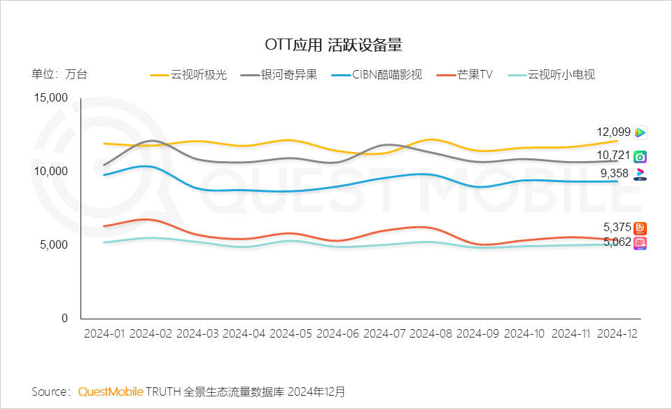 “头部版权内容+大屏视听技术迭代+家庭场景刚需“ 共同驱动OTT端应用流量提升,QuestMobile数据显示,腾讯视频、爱奇艺大屏端OTT应用云视听极光、银河奇异果流量稳定在亿级以上,截止2024年12月,活跃设备量分别达到1.21亿台和1.07亿台。