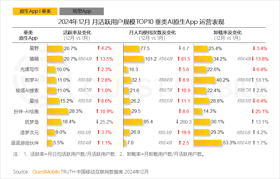 2.4 总的来说,下半年综合类原生App在使用粘性上提升明显,然而大部分依然面临卸载率高的难题;换句话说,AI的价值未被真正发挥