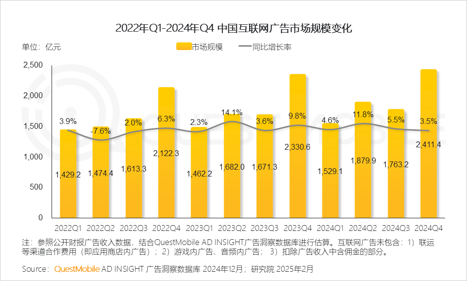 QuestMobile数据显示,2024年Q4互联网广告市场规模同比增长3.5%。