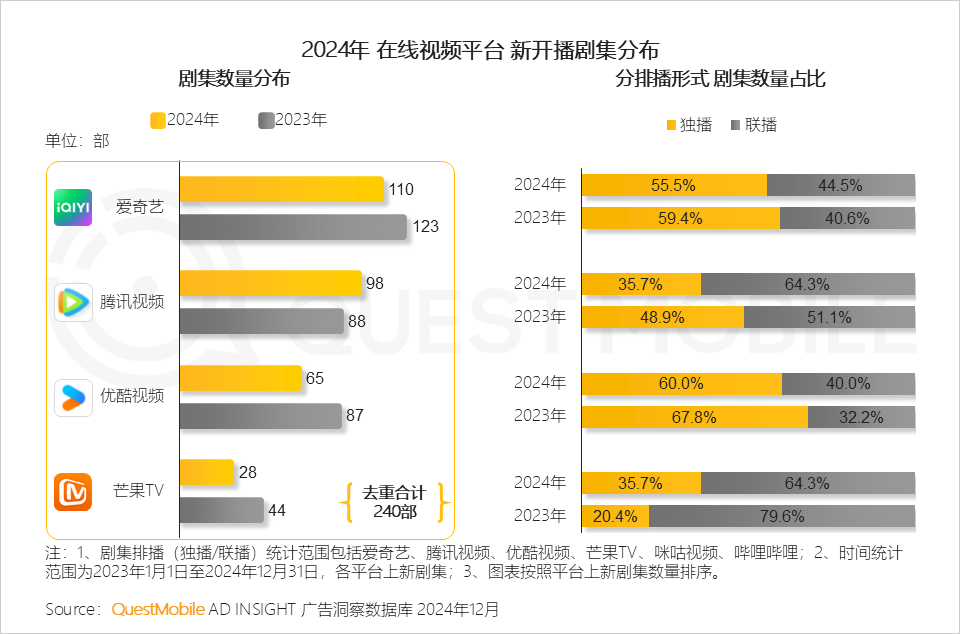 2024年四大视频平台共上新240部剧集,比2023年同比减少10.8%。同时为降低内容成本,多平台联播正在加深。