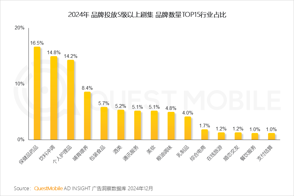 其中,保健品药品、饮料冲调、个人护理品行业高频投放剧集广告,占据市场近一半投放量。