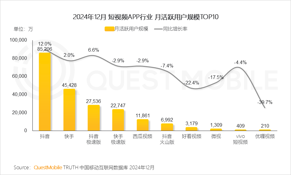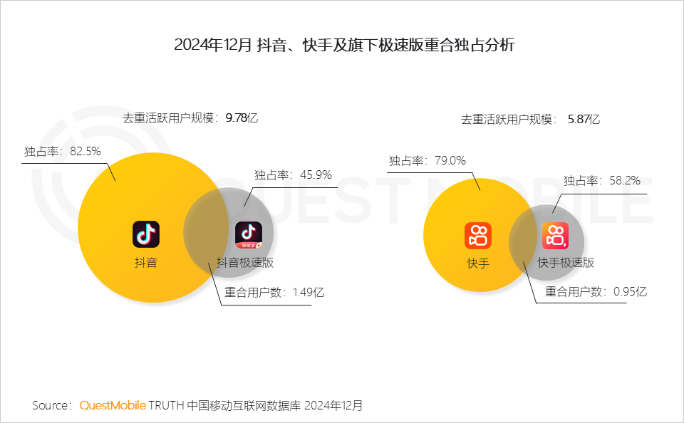 在极速版流量补充下,抖音、快手整体达到新的流量高度,QuestMobile数据显示,截止2024年12月,抖音与抖音极速版APP去重活跃用户规模达9.78亿,快手与快手极速版APP去重活跃用户规模达5.87亿。