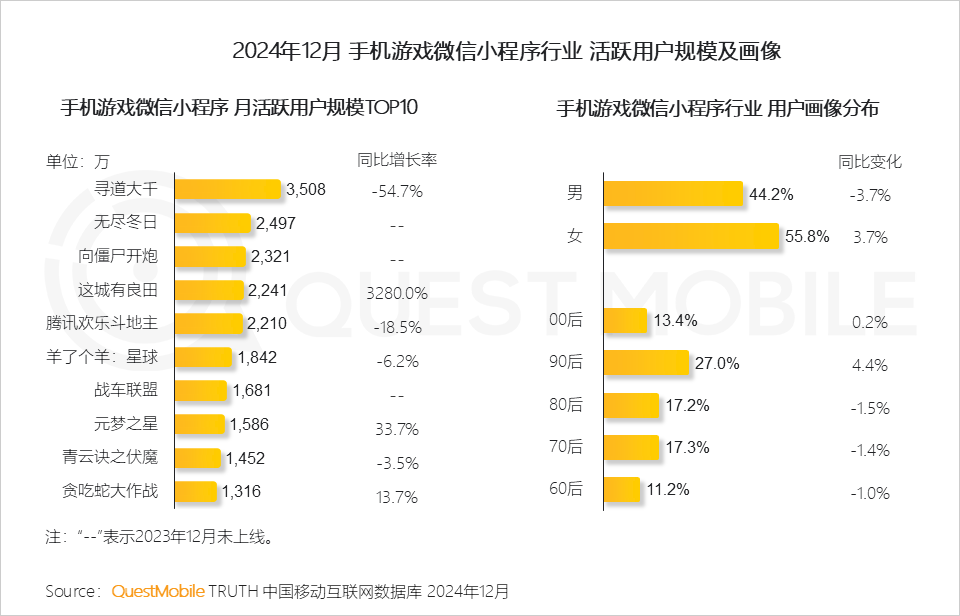QuestMobile数据显示,2024年新上线的策略类冰雪主题小游戏《无尽冬日》、塔防+RPG融合玩法小游戏《向僵尸开炮》月活跃用户规模分别达到2497万和2321万。