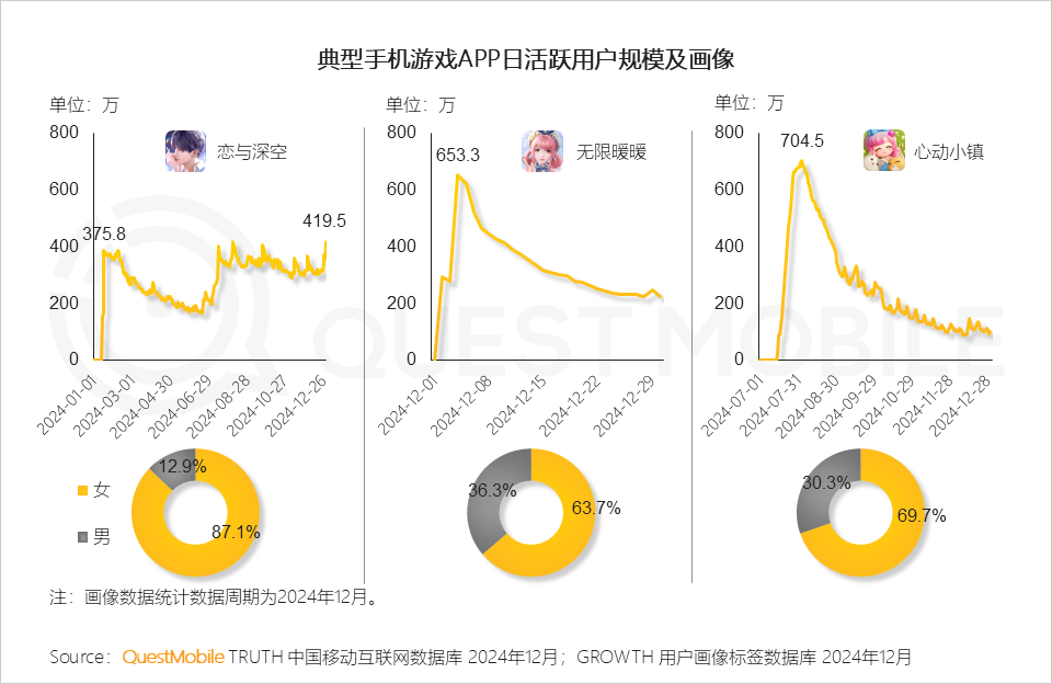 QuestMobile数据显示,叠纸游戏旗下《恋与深空》《无限暖暖》与心动公司旗下《心动小镇》聚焦女性玩家,实现了用户增长和市场突破;尤其《恋与深空》通过持续运营活动促活,2024年12月31日活跃用户规模达419.5万,为游戏上线后的新高。