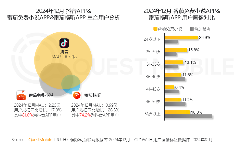 QuestMobile数据显示,番茄免费小说APP用户群体更偏年轻,35岁以下用户占比52.8%;而番茄畅听APP用户群体更偏年长,45岁以上用户占比49.3%。