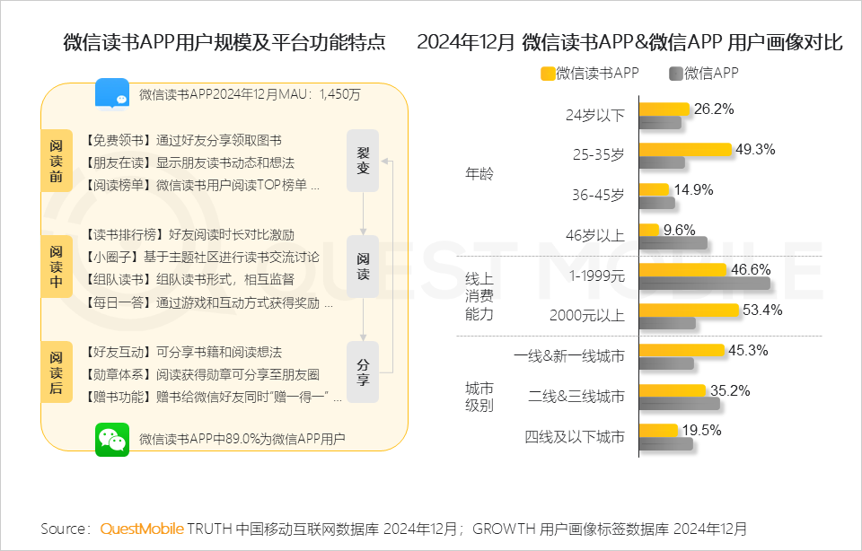 微信读书补足了微信在线阅读的生态服务版块,QuestMobile数据显示,微信读书APP用户多为一线&新一线城市、35岁以下、具有中高消费能力的群体。
