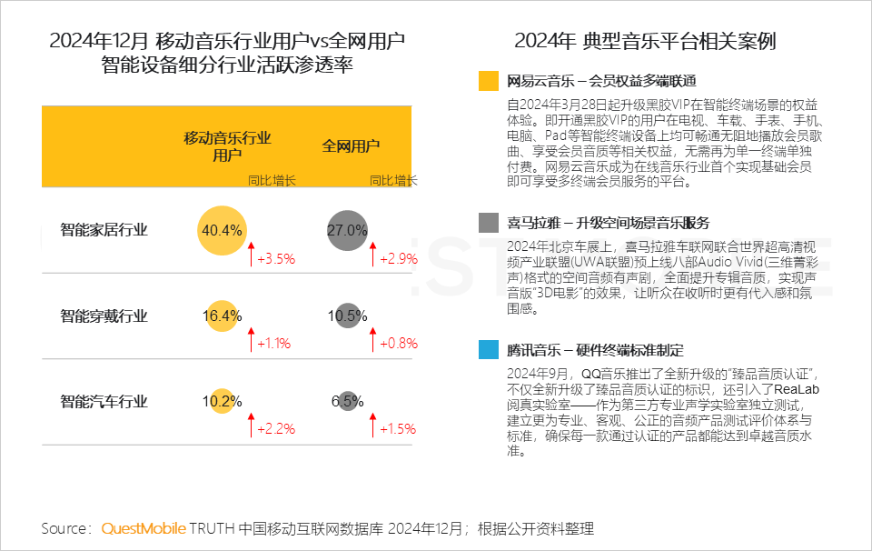 QuestMobile数据显示,移动音乐行业用户相较全网整体用户,对智能设备各细分行业有更高的活跃渗透率,且同比也保持更高的增长,突出反映他们对各类智能设备终端的使用和场景需求。