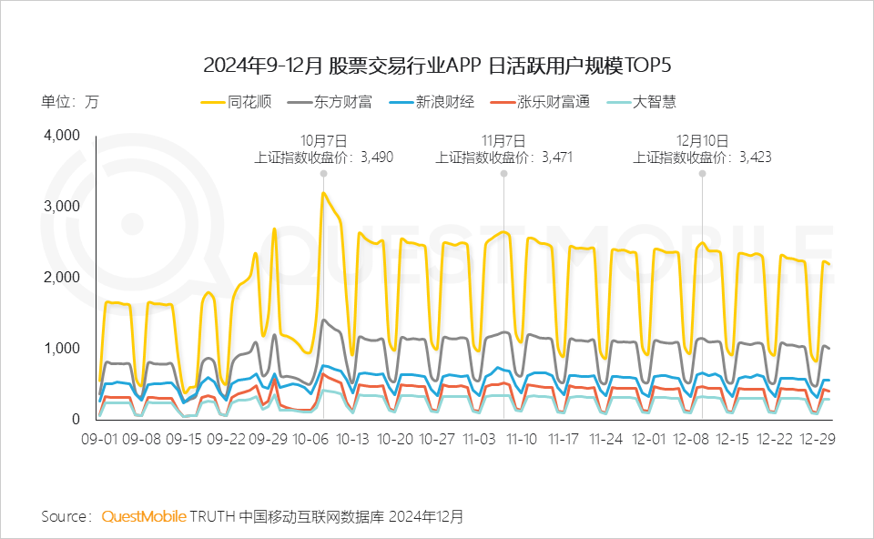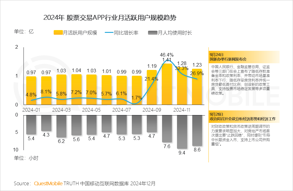 2.2 2024年9月末的多项利好政策带动沪深股市交易热潮,股票交易APP行业流量随之上涨,在10月份达到增长峰值
