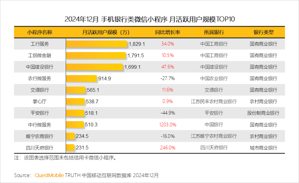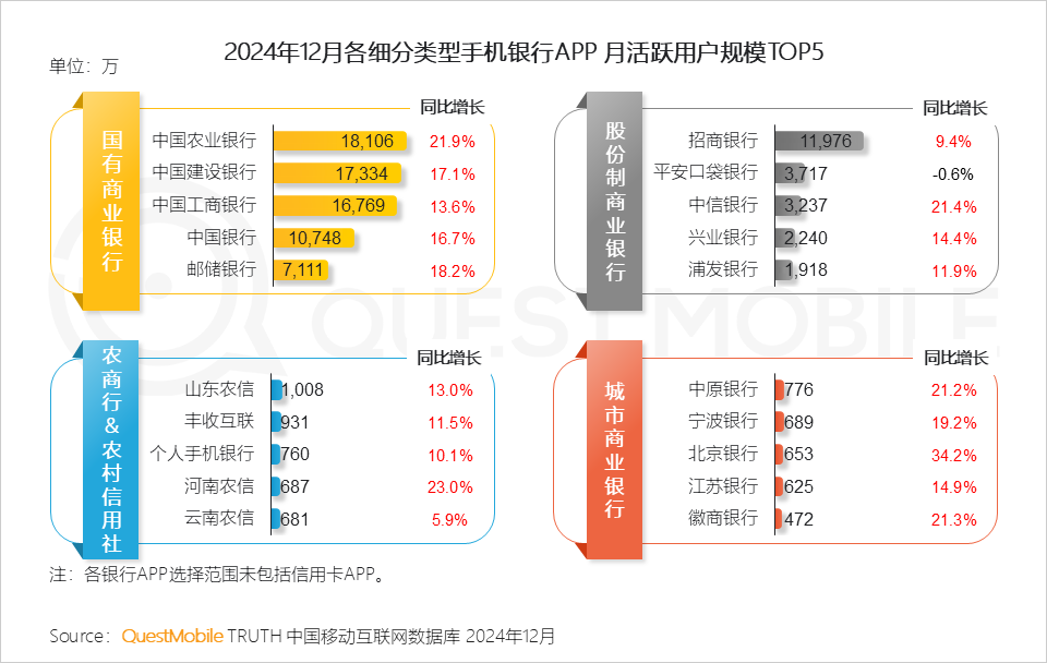 QuestMobile2024年12月数据显示,中国农业银行、中国建设银行、中国工商银行APP流量占据第一梯队,整体领先其他平台;股份制商业银行中招商银行遥遥领先,最先突破1亿用户;农商行中山东农信最先达到1000万用户规模;城商行流量相对偏低,但增速更快。