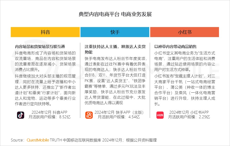 III. 抖音电商整合内容场和货架场,形成双流量场模式;快手助力达人建立经营阵地,实现电商业务增长;小红书发挥种草内容的价值,激发用户的购买欲望