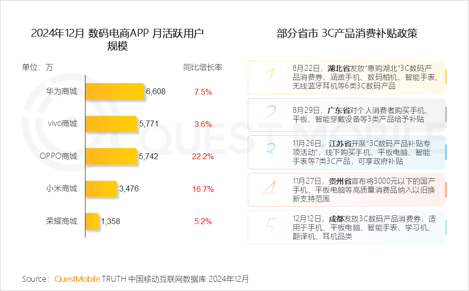 IV. 2024年下半年开始,江苏、广东、湖北等部分省份将消费电子纳入促消费补贴品类,开展相关消费电子补贴活动,在年末引发一波抢购潮,各手机品牌官方商城APP流量增长