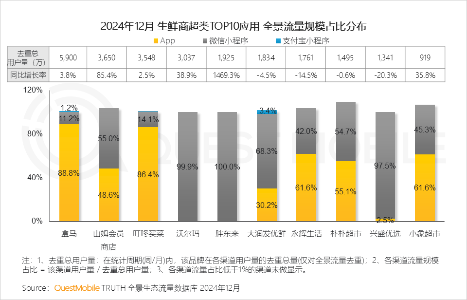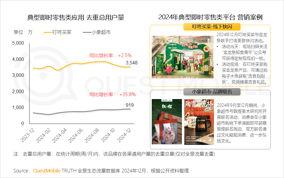 IV. 生鲜商超平台持续优化服务,以高效配送和促销活动满足消费者双旦购物及“小时达”需求,推动流量增长,其中,胖东来流量同比增速尤为突出