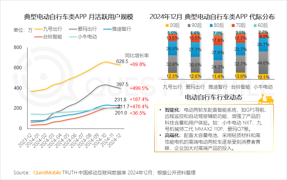 QuestMobile数据显示,2024年12月,九号出行、爱玛出行、雅迪智行、台铃智能、小牛电动APP用户主要集中在90后、80后,占比超50%,其中小牛电动在90后、80后比例最高,达71.3%。