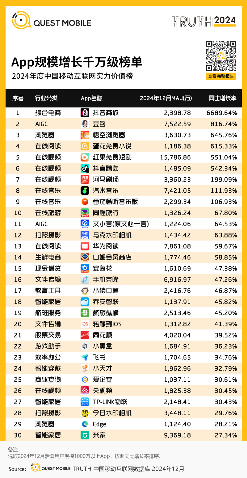 2、App规模增长千万级榜单