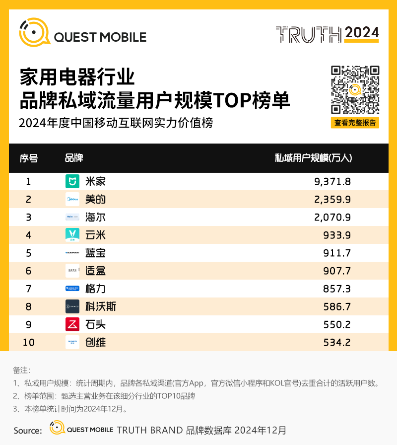 10、家用电器行业品牌私域流量用户规模TOP榜单