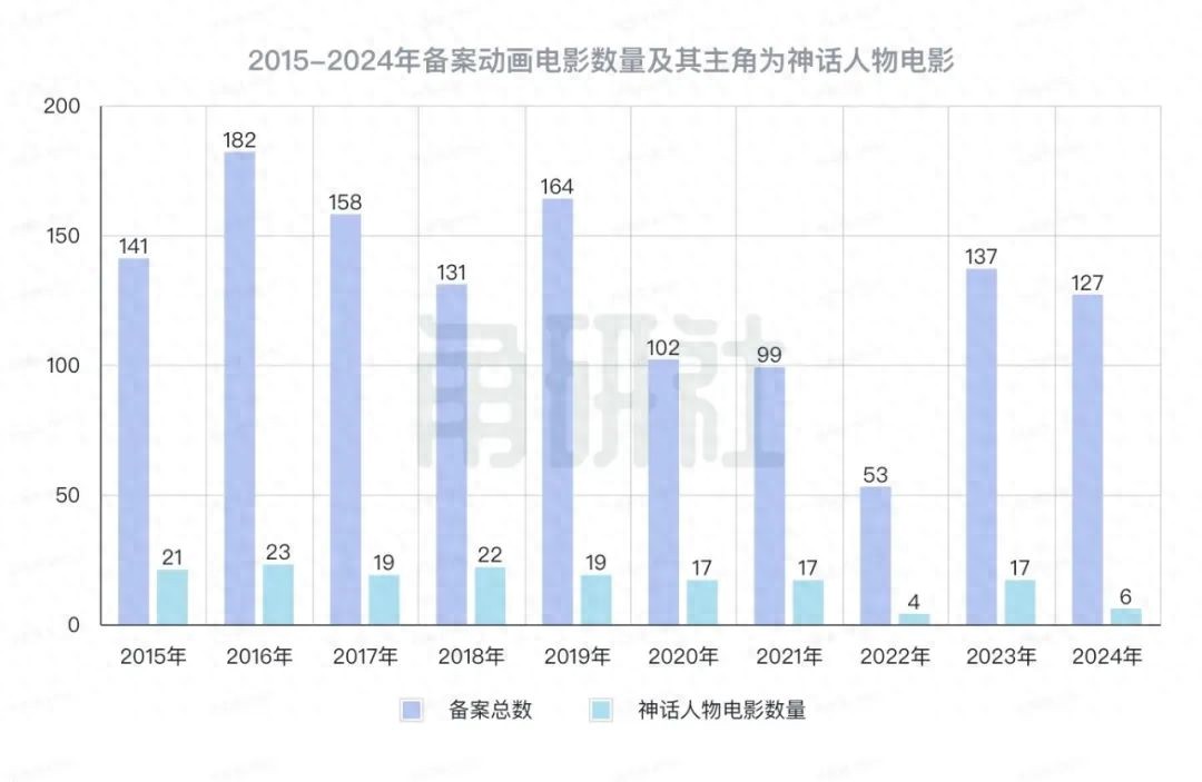 这组数字代表的,是2015年-2024年这10年,1294部国产动画电影备案了,其中有159部讲的是中国经典神话人物的故事。