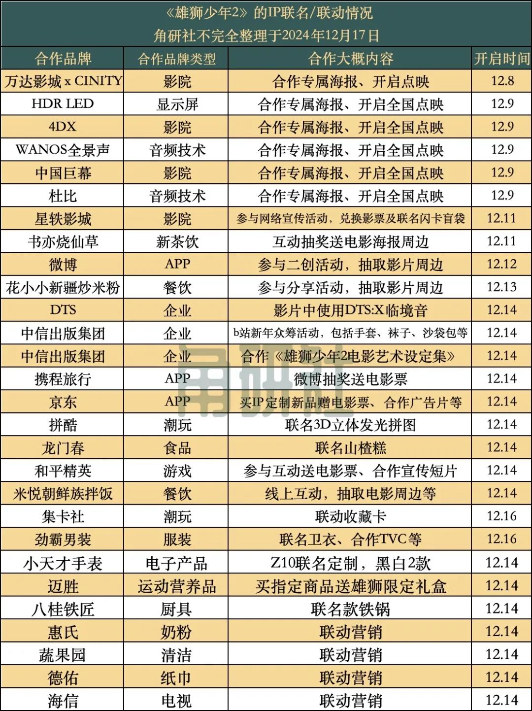根据角研社统计,2024年12月14日上映的国创动画电影《雄狮少年2》,上映时合作的品牌数量就至少有28个。