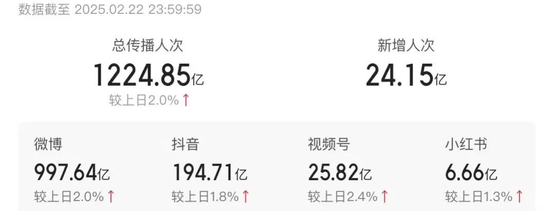 再看登顶中国影史的《哪吒2》,热搜话题已超过了7000个,累计在榜时长1123个,累计传播总人次达到了1200多亿。