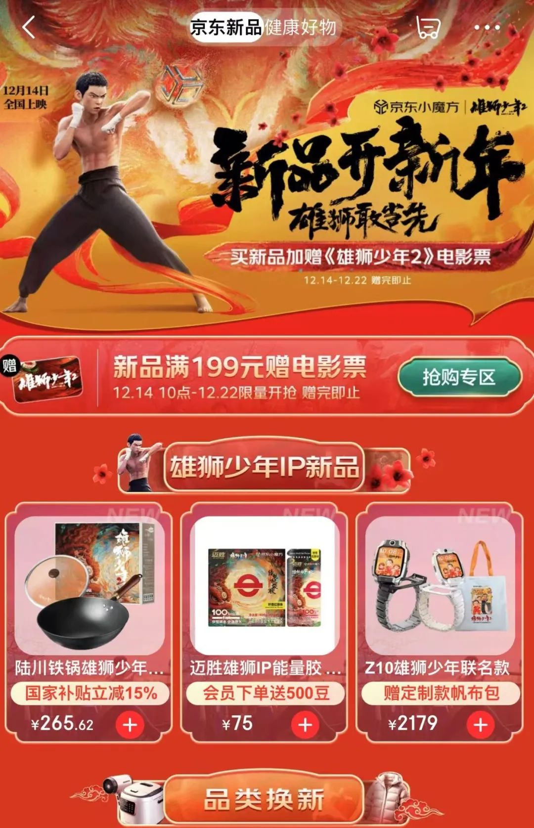 原生植入,是将合作品牌信息与电影内容和场景结合进行展示。IP联动营销,就不得不提这次京东与《雄狮少年2》的合作。除了电影内的原生广告植入,京东和《雄狮少年2》品牌广告宣传片全平台上线,京东App内上线《雄狮少年2》专题页。
