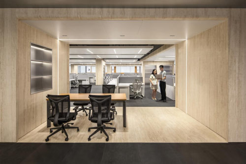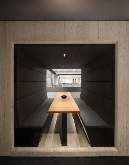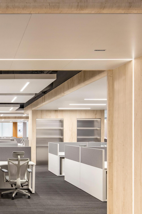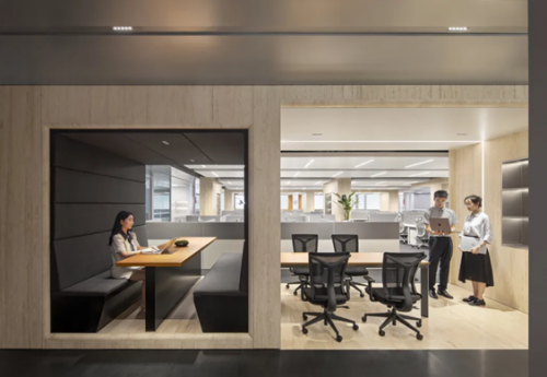 大尺度走廊与橡木转角隔断构筑半围合空间,在赋予工位独立性的同时,借由全透明会议室与开放办公区的错落分布,形成‘对景’视觉轴线——从人资部穿透ABW区域延伸至商务、产品部门,设计师通过建筑布局和空间规划塑造出南北贯通的空气流动通道,即南北“风道”,利用自然风力实现温度调节和空气循环,构建人与空间共生的动态图景。临窗区域通过开放式工位与玻璃房间的进退组合,营造出虚实相生的光影层次,将中国传统建筑美学的光影智慧转译为现代语言。