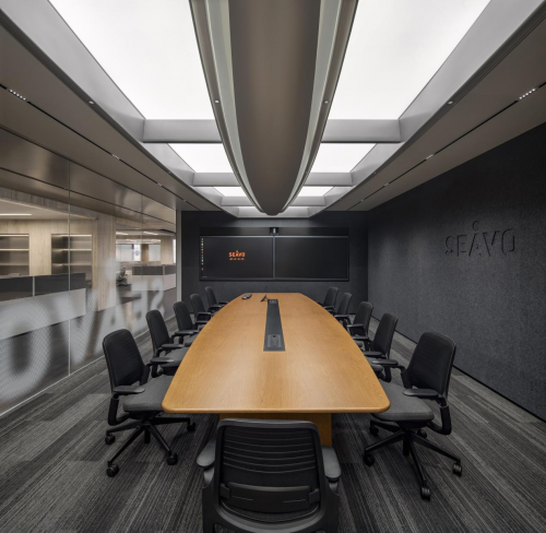 主会议室以未来主义美学为基调,顶部连续软膜光源与舰艇造型铝制吊顶构建动态光影界面,其形态逻辑与下方橡木会议桌形成拓扑学对话,隐喻“刚柔辩证”的空间叙事。智能光控系统将功能性照明升维为空间交互界面,满足高效会议、能耗管控与人性化体验的多重需求。墙面高性能聚酯纤维吸声模块,在保障会议私密性的同时,通过材质肌理的温度差,消解了工业美学的视觉压迫。
