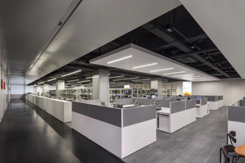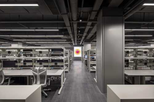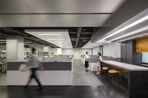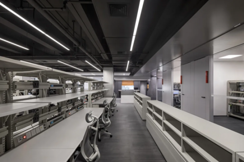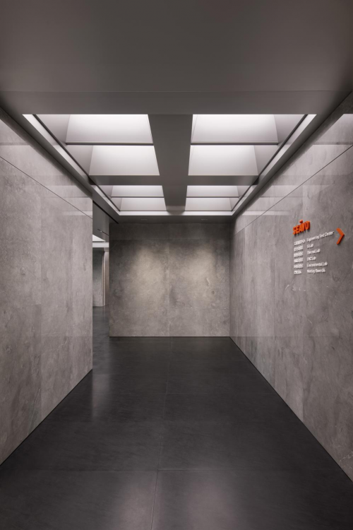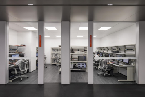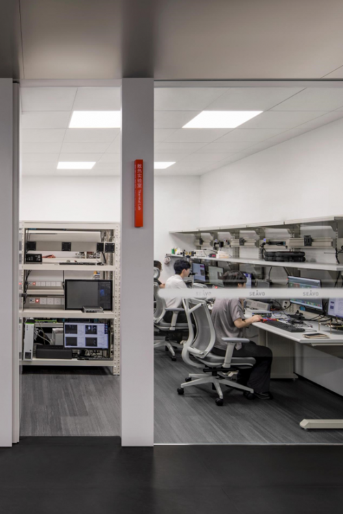 测试公共办公区被设置在采光充足的区域,保证了员工的舒适工作环境,实验办公区则采用开放式布局,利用柱子进行空间划分,形成多个独立的实验室和开放测试区,促进了团队间的紧密合作。散热实验室的透明隔断设计,既确保了独立性,又达成了通透性,整体灰白色调营造出专业而现代的氛围。