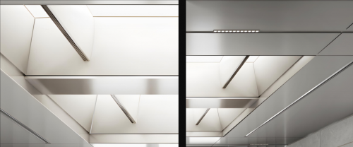 入口电梯前厅,作为空间的第一触点,被赋予“微型剧场”般的仪式感。在保留原始外立面样式的基础上,设计团队以中式横梁为灵感,结合工业风格重构传统建筑语言,通过形态整合消解原有横梁的杂乱感,达成空间调性的统一性。挑高的吊顶以极简的几何语言勾勒出空间的垂直维度,空间单元如诗般展开,摒弃冗余的软装介入,仅通过材质、比例与光线的精确控制构建“留白”的意境,创造出一个可供思绪流动的“负空间”(Negative Space)。访客置身其中,既能感受到工业美学的理性张力,又能在无物的纯粹中捕捉到时间的痕迹与空间的呼吸,从而获得一种超越物质层面的精神共鸣。