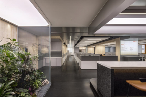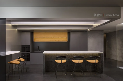 这个用思精巧的办公空间,存在着多处"诱人"的场所。过道中引入的郁郁葱葱的雨林景观,以静态的植物生长轨迹对话动态的人流轨迹,在视觉互动中为空间注入蓬勃生机。而茶歇区作为空间中的点睛之笔,在办公室各处形成优雅的视觉焦点——隐藏式灯带在导台上方洒下暖光,与金属框架的科技感形成微妙平衡,通过材质与光线的诗意融合,消解了工业风固有的冷硬质感,为理性空间注入令人驻足的人文温度。