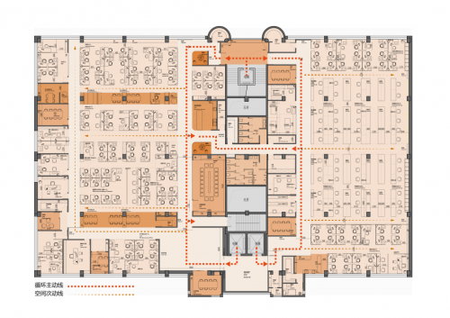 办公区围绕中央核心区展开,东侧办公区为测试产线和实验室,西侧为办公室和工位,形成多个开放式协作空间,同时通过灵活的半开放式隔断设计,确保每个区域既能独立运作,又能相互连接。一条环形走廊构成了循环主动线,会议室和休息区被巧妙嵌入动线的关键节点上,实现了工作与休息模式的无缝切换。私密工作区则被设置于相对安静的角落,通过独立通道与主循环动线相连,在保障私密性的同时,维系了空间的流动性,为员工提供了高效且舒适的工作环境。