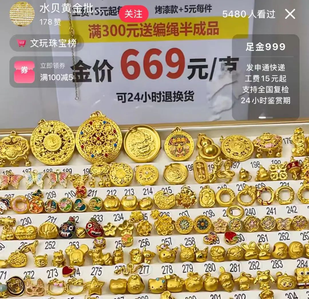 更野蛮的竞争来自深圳水贝黄金市场的一众商家,靠“低工费+大盘价直出”血洗市场,直播间的克价低至660元,工费甚至跌破10元/克,逼近成本线,个别商家甚至低至5元/克。